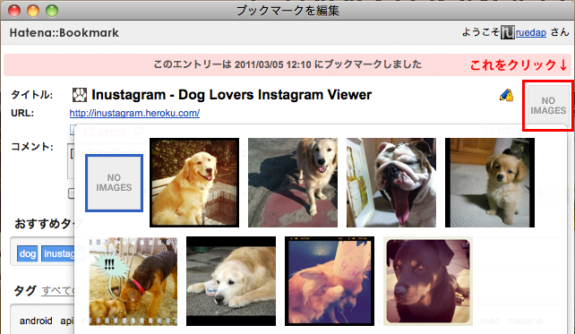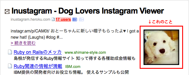 はてなブックマークのページの右側に表示されているサムネイル画像を変更できるって知らなかった。NekostagramやInstagramを公開後、時々はてブのページをチェックしてて、このサムネイル部分が最初はサイト自体のキャプチャ画像だったのに、途中からかわいいねこ写真やいぬ写真に切り替わったので「あれ?」と思ってた。