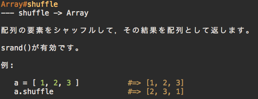 :Ref refe Array shuffle^3を実行して、リファレンスマニュアルが正常に表示されることを確認してセットアップ完了! - ref.vimなら、VimでRubyコードを開いて、*調べたいメソッド名などの上でShift+K*を押せばオッケー。