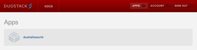 この時点で、既にhttp://duohelloworld.duostack.net/にはアクセスできるようになっており、アクセスすると「No Duostack app configured」と表示される。また、Duostackサイト上のアプリ管理画面にも生成したアプリ名が出現する。