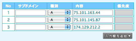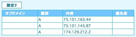|No|サブドメイン|種別|内容|優先度| |-:|:-:|-:|:-|:-:| |1|(空欄)|A|75.101.163.44|(空欄)| |2|(空欄)|A|75.101.145.87|(空欄)| |3|(空欄)|A|174.129.212.2|(空欄)|