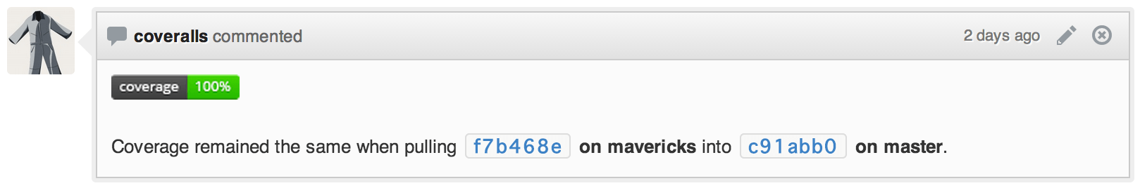 上記キャプチャは前述と同じPull Requestページのもので、このPull Requestのカバレッジが100%であることがわかる。これはカバレッジを維持するためのいいプレッシャーに…!